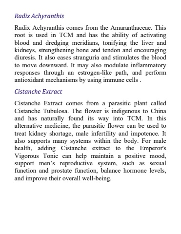 Radix AchyranthisRadix Achyranthis comes from the Amaranthaceae. This root is used in TCM and has the ability of activating blood and dredging meridians, tonifying the liver and kidneys, strengthening bone and tendon and encouraging diuresis. It also eases stranguria and stimulates the blood to move downward. It may also modulate inflammatory responses through an estrogen-like path, and perform antioxidant mechanisms by using immune cells .Cistanche ExtractCistanche Extract comes from a parasitic plant called Cistanche Tubulosa. The flower is indigenous to China and has naturally found its way into TCM. In this alternative medicine, the parasitic flower can be used to treat kidney shortage, male infertility and impotence. It also supports many systems within the body. For male health, adding Cistanche extract to the Emperor's Vigorous Tonic can help maintain a positive mood, support men%u2019s reproductive system, such as sexual function and prostate function, balance hormone levels, and improve their overall well-being.