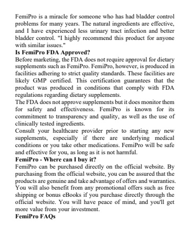 FemiPro is a miracle for someone who has had bladder control problems for many years. The natural ingredients are effective, and I have experienced less urinary tract infection and better bladder control. \with similar issues.\Is FemiPro FDA Approved?Before marketing, the FDA does not require approval for dietary supplements such as FemiPro. FemiPro, however, is produced in facilities adhering to strict quality standards. These facilities are likely GMP certified. This certification guarantees that theproduct was produced in conditions that comply with FDA regulations regarding dietary supplements.The FDA does not approve supplements but it does monitor them for safety and effectiveness. FemiPro is known for its commitment to transparency and quality, as well as the use of clinically tested ingredients.Consult your healthcare provider prior to starting any new supplements, especially if there are underlying medical conditions or you take other medications. FemiPro will be safe and effective for you, as long as it is not harmful.FemiPro - Where can I buy it?FemiPro can be purchased directly on the official website. By purchasing from the official website, you can be assured that the products are genuine and take advantage of offers and warranties.You will also benefit from any promotional offers such as free shipping or bonus eBooks if you purchase directly through the official website. You will have peace of mind, and you'll get more value from your investment.FemiPro FAQs