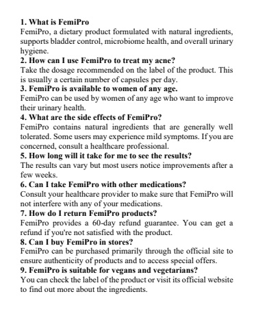 1. What is FemiProFemiPro, a dietary product formulated with natural ingredients, supports bladder control, microbiome health, and overall urinary hygiene.2. How can I use FemiPro to treat my acne?Take the dosage recommended on the label of the product. This is usually a certain number of capsules per day.3. FemiPro is available to women of any age.FemiPro can be used by women of any age who want to improve their urinary health.4. What are the side effects of FemiPro?FemiPro contains natural ingredients that are generally well tolerated. Some users may experience mild symptoms. If you are concerned, consult a healthcare professional.5. How long will it take for me to see the results?The results can vary but most users notice improvements after a few weeks.6. Can I take FemiPro with other medications?Consult your healthcare provider to make sure that FemiPro will not interfere with any of your medications.7. How do I return FemiPro products?FemiPro provides a 60-day refund guarantee. You can get a refund if you're not satisfied with the product.8. Can I buy FemiPro in stores?FemiPro can be purchased primarily through the official site to ensure authenticity of products and to access special offers.9. FemiPro is suitable for vegans and vegetarians?You can check the label of the product or visit its official website to find out more about the ingredients.
