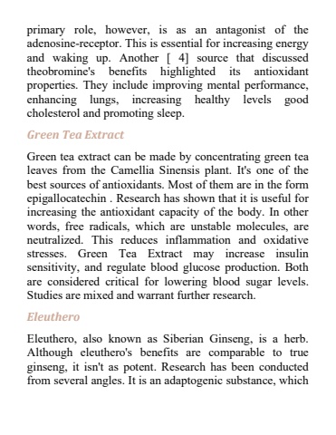 primary role, however, is as an antagonist of the adenosine-receptor. This is essential for increasing energy and waking up. Another [ 4] source that discussed theobromine's benefits highlighted its antioxidant properties. They include improving mental performance, enhancing lungs, increasing healthy levels good cholesterol and promoting sleep.Green Tea ExtractGreen tea extract can be made by concentrating green tea leaves from the Camellia Sinensis plant. It's one of the best sources of antioxidants. Most of them are in the form epigallocatechin . Research has shown that it is useful for increasing the antioxidant capacity of the body. In other words, free radicals, which are unstable molecules, are neutralized. This reduces inflammation and oxidative stresses. Green Tea Extract may increase insulin sensitivity, and regulate blood glucose production. Both are considered critical for lowering blood sugar levels. Studies are mixed and warrant further research.EleutheroEleuthero, also known as Siberian Ginseng, is a herb. Although eleuthero's benefits are comparable to true ginseng, it isn't as potent. Research has been conducted from several angles. It is an adaptogenic substance, which