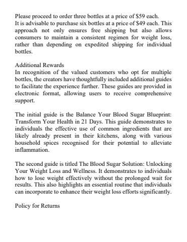 Please proceed to order three bottles at a price of $59 each.It is advisable to purchase six bottles at a price of $49 each. This approach not only ensures free shipping but also allows consumers to maintain a consistent regimen for weight loss, rather than depending on expedited shipping for individual bottles.Additional RewardsIn recognition of the valued customers who opt for multiple bottles, the creators have thoughtfully included additional guides to facilitate the experience further. These guides are provided in electronic format, allowing users to receive comprehensive support.The initial guide is the Balance Your Blood Sugar Blueprint: Transform Your Health in 21 Days. This guide demonstrates to individuals the effective use of common ingredients that are likely already present in their kitchens, along with various household spices recognised for their potential to alleviate inflammation.The second guide is titled The Blood Sugar Solution: Unlocking Your Weight Loss and Wellness. It demonstrates to individuals how to lose weight effectively without the prolonged wait for results. This also highlights an essential routine that individuals can incorporate to enhance their weight loss efforts significantly.Policy for Returns