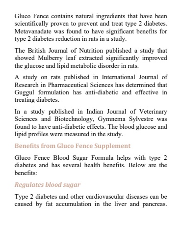Gluco Fence contains natural ingredients that have been scientifically proven to prevent and treat type 2 diabetes. Metavanadate was found to have significant benefits for type 2 diabetes reduction in rats in a study.The British Journal of Nutrition published a study that showed Mulberry leaf extracted significantly improved the glucose and lipid metabolic disorder in rats.A study on rats published in International Journal of Research in Pharmaceutical Sciences has determined that Guggul formulation has anti-diabetic and effective in treating diabetes.In a study published in Indian Journal of Veterinary Sciences and Biotechnology, Gymnema Sylvestre was found to have anti-diabetic effects. The blood glucose and lipid profiles were measured in the study.Benefits from Gluco Fence SupplementGluco Fence Blood Sugar Formula helps with type 2 diabetes and has several health benefits. Below are the benefits:Regulates blood sugarType 2 diabetes and other cardiovascular diseases can be caused by fat accumulation in the liver and pancreas.