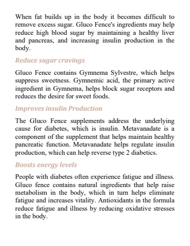 When fat builds up in the body it becomes difficult to remove excess sugar. Gluco Fence's ingredients may help reduce high blood sugar by maintaining a healthy liver and pancreas, and increasing insulin production in the body.Reduce sugar cravingsGluco Fence contains Gymnema Sylvestre, which helps suppress sweetness. Gymnemic acid, the primary active ingredient in Gymnema, helps block sugar receptors and reduces the desire for sweet foods.Improves insulin ProductionThe Gluco Fence supplements address the underlying cause for diabetes, which is insulin. Metavanadate is a component of the supplement that helps maintain healthy pancreatic function. Metavanadate helps regulate insulin production, which can help reverse type 2 diabetics.Boosts energy levelsPeople with diabetes often experience fatigue and illness. Gluco fence contains natural ingredients that help raise metabolism in the body, which in turn helps eliminate fatigue and increases vitality. Antioxidants in the formula reduce fatigue and illness by reducing oxidative stresses in the body.