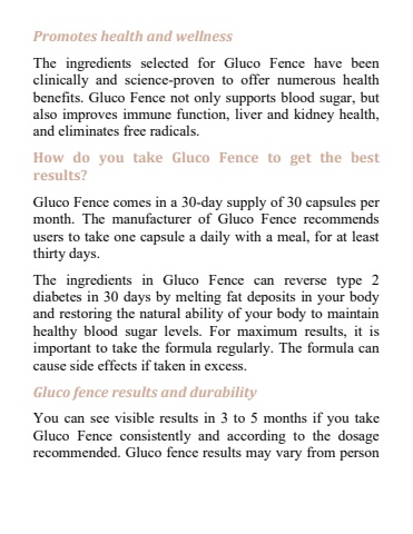 Promotes health and wellnessThe ingredients selected for Gluco Fence have been clinically and science-proven to offer numerous health benefits. Gluco Fence not only supports blood sugar, but also improves immune function, liver and kidney health, and eliminates free radicals.How do you take Gluco Fence to get the best results?Gluco Fence comes in a 30-day supply of 30 capsules per month. The manufacturer of Gluco Fence recommends users to take one capsule a daily with a meal, for at least thirty days.The ingredients in Gluco Fence can reverse type 2 diabetes in 30 days by melting fat deposits in your body and restoring the natural ability of your body to maintain healthy blood sugar levels. For maximum results, it is important to take the formula regularly. The formula can cause side effects if taken in excess.Gluco fence results and durabilityYou can see visible results in 3 to 5 months if you take Gluco Fence consistently and according to the dosage recommended. Gluco fence results may vary from person