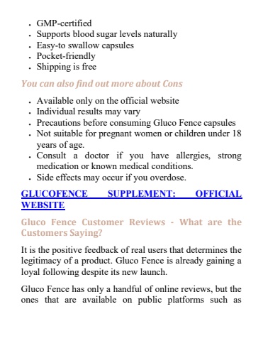 %uf0b7 GMP-certified%uf0b7 Supports blood sugar levels naturally%uf0b7 Easy-to swallow capsules%uf0b7 Pocket-friendly%uf0b7 Shipping is freeYou can also find out more about Cons%uf0b7 Available only on the official website%uf0b7 Individual results may vary%uf0b7 Precautions before consuming Gluco Fence capsules%uf0b7 Not suitable for pregnant women or children under 18 years of age.%uf0b7 Consult a doctor if you have allergies, strong medication or known medical conditions.%uf0b7 Side effects may occur if you overdose.GLUCOFENCE SUPPLEMENT: OFFICIAL WEBSITEGluco Fence Customer Reviews - What are the Customers Saying?It is the positive feedback of real users that determines the legitimacy of a product. Gluco Fence is already gaining a loyal following despite its new launch.Gluco Fence has only a handful of online reviews, but the ones that are available on public platforms such as