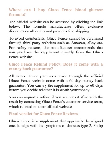 Where can I buy Gluco Fence blood glucose formula?The official website can be accessed by clicking the link below. The formula manufacturer offers exclusive discounts on all orders and provides free shipping.To avoid counterfeits, Gluco Fence cannot be purchased through third-party websites such as Amazon, eBay etc. For safety reasons, the manufacturer recommends that you purchase the supplement directly from the Gluco Fence website.Gluco Fence Refund Policy: Does it come with a money back guarantee?All Gluco Fence purchases made through the official Gluco Fence website come with a 60-day money back guarantee. You can try the supplement for up to 60 days before you decide whether it is worth your money.You can request a refund if you are not satisfied with the result by contacting Gluco Fence's customer service team, which is listed on their official website.Final verdict for Gluco Fence ReviewsGluco Fence is a supplement that appears to be a good one. It helps with the symptoms of diabetes type 2. Philip