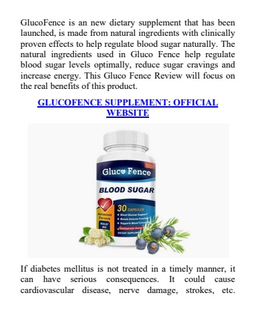 GlucoFence is an new dietary supplement that has been launched, is made from natural ingredients with clinically proven effects to help regulate blood sugar naturally. The natural ingredients used in Gluco Fence help regulate blood sugar levels optimally, reduce sugar cravings and increase energy. This Gluco Fence Review will focus on the real benefits of this product.GLUCOFENCE SUPPLEMENT: OFFICIAL WEBSITEIf diabetes mellitus is not treated in a timely manner, it can have serious consequences. It could cause cardiovascular disease, nerve damage, strokes, etc.