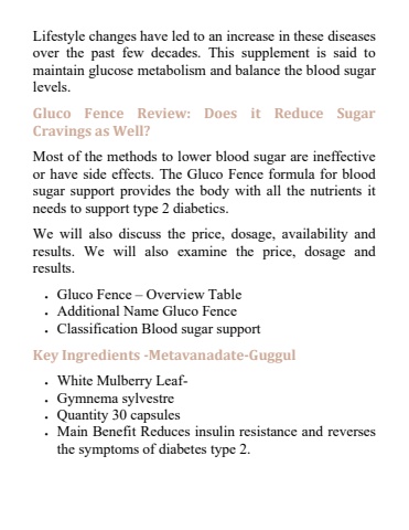 Lifestyle changes have led to an increase in these diseases over the past few decades. This supplement is said to maintain glucose metabolism and balance the blood sugar levels.Gluco Fence Revie Does it Reduce Sugar Cravings as Well?Most of the methods to lower blood sugar are ineffective or have side effects. The Gluco Fence formula for blood sugar support provides the body with all the nutrients it needs to support type 2 diabetics.We will also discuss the price, dosage, availability and results. We will also examine the price, dosage and results.%uf0b7 Gluco Fence %u2013 Overview Table%uf0b7 Additional Name Gluco Fence%uf0b7 Classification Blood sugar supportKey Ingredients -Metavanadate-Guggul%uf0b7 White Mulberry Leaf-%uf0b7 Gymnema sylvestre%uf0b7 Quantity 30 capsules%uf0b7 Main Benefit Reduces insulin resistance and reverses the symptoms of diabetes type 2.