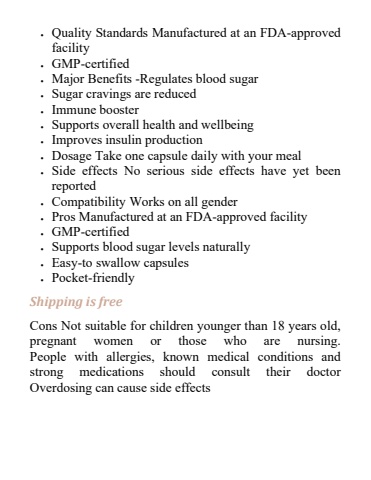 %uf0b7 Quality Standards Manufactured at an FDA-approved facility%uf0b7 GMP-certified%uf0b7 Major Benefits -Regulates blood sugar%uf0b7 Sugar cravings are reduced%uf0b7 Immune booster%uf0b7 Supports overall health and wellbeing%uf0b7 Improves insulin production%uf0b7 Dosage Take one capsule daily with your meal%uf0b7 Side effects No serious side effects have yet been reported%uf0b7 Compatibility Works on all gender%uf0b7 Pros Manufactured at an FDA-approved facility%uf0b7 GMP-certified%uf0b7 Supports blood sugar levels naturally%uf0b7 Easy-to swallow capsules%uf0b7 Pocket-friendlyShipping is freeCons Not suitable for children younger than 18 years old, pregnant women or those who are nursing.People with allergies, known medical conditions and strong medications should consult their doctorOverdosing can cause side effects