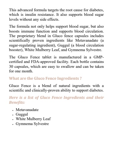 This advanced formula targets the root cause for diabetes, which is insulin resistance. It also supports blood sugar levels without any side effects.The formula not only helps support blood sugar, but also boosts immune function and supports blood circulation. The proprietary blend in Gluco fence capsules includes scientifically proven ingredients like Metavanadate (a sugar-regulating ingredient), Guggul (a blood circulation booster), White Mulberry Leaf, and Gymnema Sylvestre.The Gluco Fence tablet is manufactured in a GMPcertified and FDA-approved facility. Each bottle contains 30 capsules, which are easy to swallow and can be taken for one month.What are the Gluco Fence Ingredients ?Gluco Fence is a blend of natural ingredients with a scientific and clinically-proven ability to support diabetes.Here is a list of Gluco Fence Ingredients and their Benefits:%uf0b7 Metavanadate%uf0b7 Guggul%uf0b7 White Mulberry Leaf%uf0b7 Gymnema Sylvestre