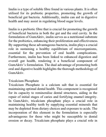 Inulin is a type of soluble fibre found in various plants. It is often utilised for its prebiotic properties, promoting the growth of beneficial gut bacteria. Additionally, inulin can aid in digestive health and may assist in regulating blood sugar levels.Inulin is a prebiotic fibre that is crucial for promoting the growth of beneficial bacteria in both the gut and the oral cavity. In the formulation of GumAktiv, inulin serves as a nutritional substrate for the probiotics, enhancing their proliferation and effectiveness. By supporting these advantageous bacteria, inulin plays a crucial role in sustaining a healthy equilibrium of microorganisms, essential for the prevention of oral health complications. Furthermore, inulin has been linked to enhanced digestion and overall gut health, rendering it a beneficial component of GumAktiv%u2019s formulation. The dual advantage of promoting both oral and digestive health highlights the thorough methodology of GumAktiv.Tricalcium PhosphateTricalcium Phosphate is a calcium salt that is essential for maintaining optimal dental health. This component is recognised for its capacity to remineralise dental structures, aiding in the repair of initial stages of caries and fortifying enamel integrity. In GumAktiv, tricalcium phosphate plays a crucial role in maintaining healthy teeth by supplying essential minerals that may be depleted from dietary choices and exposure to acids. The incorporation of this element in the formulation is especially advantageous for those who might be susceptible to dental erosion or decay. Tricalcium phosphate plays a crucial role in