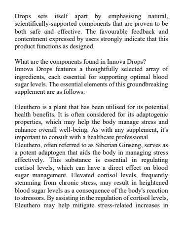Drops sets itself apart by emphasising natural, scientifically-supported components that are proven to be both safe and effective. The favourable feedback and contentment expressed by users strongly indicate that this product functions as designed.What are the components found in Innova Drops?Innova Drops features a thoughtfully selected array of ingredients, each essential for supporting optimal blood sugar levels. The essential elements of this groundbreaking supplement are as follows:Eleuthero is a plant that has been utilised for its potential health benefits. It is often considered for its adaptogenic properties, which may help the body manage stress and enhance overall well-being. As with any supplement, it's important to consult with a healthcare professionalEleuthero, often referred to as Siberian Ginseng, serves as a potent adaptogen that aids the body in managing stress effectively. This substance is essential in regulating cortisol levels, which can have a direct effect on blood sugar management. Elevated cortisol levels, frequently stemming from chronic stress, may result in heightened blood sugar levels as a consequence of the body's reaction to stressors. By assisting in the regulation of cortisol levels, Eleuthero may help mitigate stress-related increases in