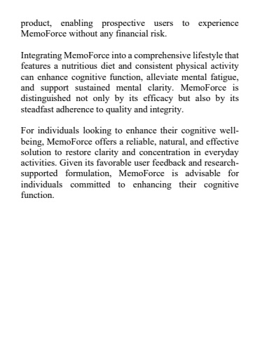 product, enabling prospective users to experience MemoForce without any financial risk.Integrating MemoForce into a comprehensive lifestyle that features a nutritious diet and consistent physical activity can enhance cognitive function, alleviate mental fatigue, and support sustained mental clarity. MemoForce is distinguished not only by its efficacy but also by its steadfast adherence to quality and integrity.For individuals looking to enhance their cognitive wellbeing, MemoForce offers a reliable, natural, and effective solution to restore clarity and concentration in everyday activities. Given its favorable user feedback and researchsupported formulation, MemoForce is advisable for individuals committed to enhancing their cognitive function.