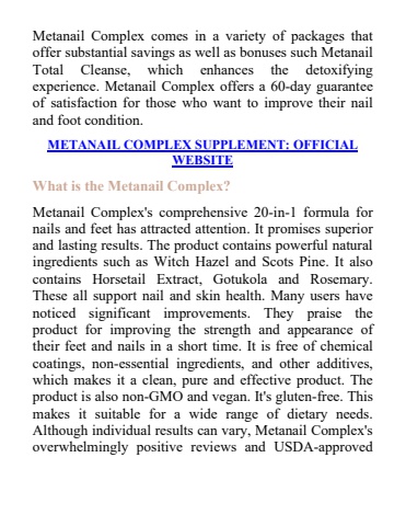 Metanail Complex comes in a variety of packages that offer substantial savings as well as bonuses such Metanail Total Cleanse, which enhances the detoxifying experience. Metanail Complex offers a 60-day guarantee of satisfaction for those who want to improve their nail and foot condition.METANAIL COMPLEX SUPPLEMENT: OFFICIAL WEBSITEWhat is the Metanail Complex?Metanail Complex's comprehensive 20-in-1 formula for nails and feet has attracted attention. It promises superior and lasting results. The product contains powerful natural ingredients such as Witch Hazel and Scots Pine. It also contains Horsetail Extract, Gotukola and Rosemary. These all support nail and skin health. Many users have noticed significant improvements. They praise the product for improving the strength and appearance of their feet and nails in a short time. It is free of chemical coatings, non-essential ingredients, and other additives, which makes it a clean, pure and effective product. The product is also non-GMO and vegan. It's gluten-free. This makes it suitable for a wide range of dietary needs. Although individual results can vary, Metanail Complex's overwhelmingly positive reviews and USDA-approved