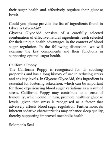 their sugar health and effectively regulate their glucose levels.Could you please provide the list of ingredients found in Glycens GlycoAid?Glycens GlycoAid consists of a carefully selected combination of effective natural ingredients, each selected for their unique health advantages in the context of blood sugar regulation. In the following discussion, we will examine the key components and their functions in supporting optimal sugar health.California PoppyThe California Poppy is recognised for its soothing properties and has a long history of use in reducing stress and anxiety levels. In Glycens GlycoAid, this ingredient is essential for fostering relaxation, which can be important for those experiencing blood sugar variations as a result of stress. California Poppy may contribute to a sense of tranquilly, which could, in turn, promote healthier glucose levels, given that stress is recognised as a factor that adversely affects blood sugar regulation. Furthermore, its inherent sedative characteristics may enhance sleep quality, thereby supporting improved metabolic health.Solomon's Seal
