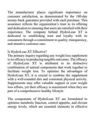 The manufacturer places significant importance on customer satisfaction, as demonstrated by the 180-day money-back guarantee provided with each purchase. This assurance reflects the organization%u2019s trust in its offering and dedication to ensuring that users are satisfied with their experience. The company behind HydroLean XT is dedicated to establishing trust and loyalty with its consumers through a commitment to quality, transparency, and attentive customer care.Is HydroLean XT Effective?The primary inquiry regarding any weight loss supplement is its efficacy in producing tangible outcomes. The efficacy of HydroLean XT is attributed to its distinctive combination of natural components that work together to facilitate weight loss. To optimise the advantages of HydroLean XT, it is crucial to combine the supplement with a well-rounded diet and consistent physical activity. Supplements may offer valuable support in your weight loss efforts, yet their efficacy is maximised when they are part of a comprehensive healthy lifestyle.The components of HydroLean XT are formulated to optimise metabolic function, control appetite, and elevate energy levels, which are essential elements in effective