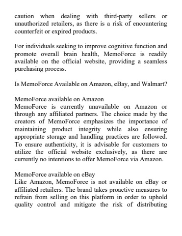 caution when dealing with third-party sellers or unauthorized retailers, as there is a risk of encountering counterfeit or expired products.For individuals seeking to improve cognitive function and promote overall brain health, MemoForce is readily available on the official website, providing a seamless purchasing process.Is MemoForce Available on Amazon, eBay, and Walmart?MemoForce available on AmazonMemoForce is currently unavailable on Amazon or through any affiliated partners. The choice made by the creators of MemoForce emphasizes the importance of maintaining product integrity while also ensuring appropriate storage and handling practices are followed. To ensure authenticity, it is advisable for customers to utilize the official website exclusively, as there are currently no intentions to offer MemoForce via Amazon.MemoForce available on eBayLike Amazon, MemoForce is not available on eBay or affiliated retailers. The brand takes proactive measures to refrain from selling on this platform in order to uphold quality control and mitigate the risk of distributing