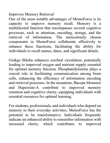 Improves Memory RetrievalOne of the most notable advantages of MemoForce is its capacity to improve memory recall. Memory is a multifaceted function that encompasses several cognitive processes, such as attention, encoding, storage, and the retrieval of information. The meticulously chosen components in MemoForce collaborate effectively to enhance these functions, facilitating the ability for individuals to recall names, dates, and significant details.Ginkgo Biloba enhances cerebral circulation, potentially leading to improved oxygen and nutrient supply essential for optimal memory function. Phosphatidylserine plays a crucial role in facilitating communication among brain cells, enhancing the efficiency of information encoding and retrieval processes. In the meantime, Bacopa Monnieri and Huperzine-A contribute to improved memory retention and cognitive clarity, equipping individuals with essential resources for optimal learning.For students, professionals, and individuals who depend on memory in their everyday activities, MemoForce has the potential to be transformative. Individuals frequently indicate an enhanced ability to remember information with increased clarity, which contributes to improved