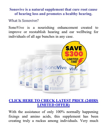 Sonovive is a natural supplement that cure root cause of hearing loss and promotes a healthy hearing.What Is Sonovive?SonoVive is a nourishing enhancement created to improve or reestablish hearing and ear wellbeing for individuals of all age bunches in any case.CLICK HERE TO CHECK LATEST PRICE (24HRS LIMITED OFFER)With the assistance of only 100% normally happening fixings and amino acids, this supplement has been creating truly a ruckus among individuals. Very much