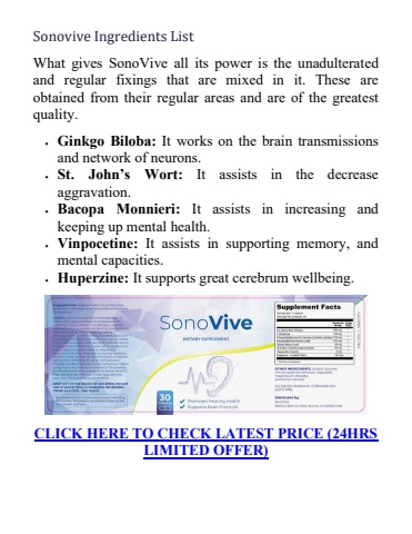 Sonovive Ingredients ListWhat gives SonoVive all its power is the unadulterated and regular fixings that are mixed in it. These are obtained from their regular areas and are of the greatest quality.%uf0b7 Ginkgo Biloba: It works on the brain transmissions and network of neurons.%uf0b7 St. John%u2019s Wort: It assists in the decrease aggravation.%uf0b7 Bacopa Monnieri: It assists in increasing and keeping up mental health.%uf0b7 Vinpocetine: It assists in supporting memory, and mental capacities.%uf0b7 Huperzine: It supports great cerebrum wellbeing.CLICK HERE TO CHECK LATEST PRICE (24HRS LIMITED OFFER)