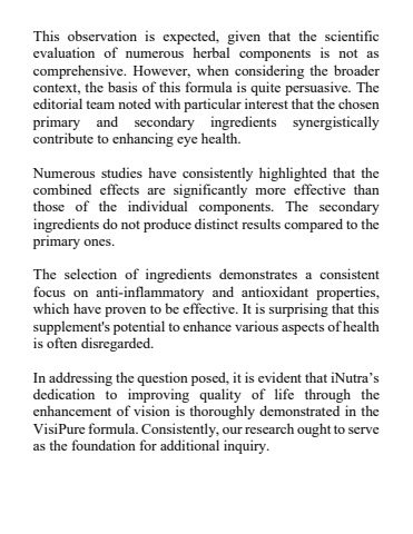 This observation is expected, given that the scientific evaluation of numerous herbal components is not as comprehensive. However, when considering the broader context, the basis of this formula is quite persuasive. The editorial team noted with particular interest that the chosen primary and secondary ingredients synergistically contribute to enhancing eye health.Numerous studies have consistently highlighted that the combined effects are significantly more effective than those of the individual components. The secondary ingredients do not produce distinct results compared to the primary ones.The selection of ingredients demonstrates a consistent focus on anti-inflammatory and antioxidant properties, which have proven to be effective. It is surprising that this supplement's potential to enhance various aspects of health is often disregarded.In addressing the question posed, it is evident that iNutra%u2019s dedication to improving quality of life through the enhancement of vision is thoroughly demonstrated in the VisiPure formula. Consistently, our research ought to serve as the foundation for additional inquiry.