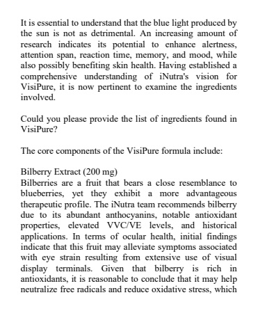 It is essential to understand that the blue light produced by the sun is not as detrimental. An increasing amount of research indicates its potential to enhance alertness, attention span, reaction time, memory, and mood, while also possibly benefiting skin health. Having established a comprehensive understanding of iNutra's vision for VisiPure, it is now pertinent to examine the ingredients involved.Could you please provide the list of ingredients found in VisiPure?The core components of the VisiPure formula include:Bilberry Extract (200 mg)Bilberries are a fruit that bears a close resemblance to blueberries, yet they exhibit a more advantageous therapeutic profile. The iNutra team recommends bilberry due to its abundant anthocyanins, notable antioxidant properties, elevated VVC/VE levels, and historical applications. In terms of ocular health, initial findings indicate that this fruit may alleviate symptoms associated with eye strain resulting from extensive use of visual display terminals. Given that bilberry is rich in antioxidants, it is reasonable to conclude that it may help neutralize free radicals and reduce oxidative stress, which