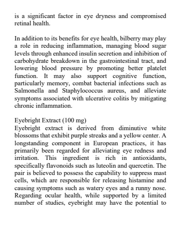 is a significant factor in eye dryness and compromised retinal health.In addition to its benefits for eye health, bilberry may play a role in reducing inflammation, managing blood sugar levels through enhanced insulin secretion and inhibition of carbohydrate breakdown in the gastrointestinal tract, and lowering blood pressure by promoting better platelet function. It may also support cognitive function, particularly memory, combat bacterial infections such as Salmonella and Staphylococcus aureus, and alleviate symptoms associated with ulcerative colitis by mitigating chronic inflammation.Eyebright Extract (100 mg)Eyebright extract is derived from diminutive white blossoms that exhibit purple streaks and a yellow center. A longstanding component in European practices, it has primarily been regarded for alleviating eye redness and irritation. This ingredient is rich in antioxidants, specifically flavonoids such as luteolin and quercetin. The pair is believed to possess the capability to suppress mast cells, which are responsible for releasing histamine and causing symptoms such as watery eyes and a runny nose. Regarding ocular health, while supported by a limited number of studies, eyebright may have the potential to