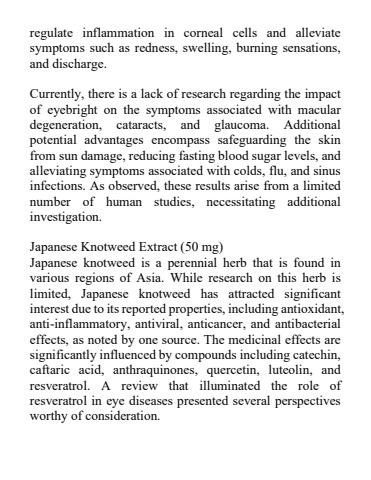 regulate inflammation in corneal cells and alleviate symptoms such as redness, swelling, burning sensations, and discharge.Currently, there is a lack of research regarding the impact of eyebright on the symptoms associated with macular degeneration, cataracts, and glaucoma. Additional potential advantages encompass safeguarding the skin from sun damage, reducing fasting blood sugar levels, and alleviating symptoms associated with colds, flu, and sinus infections. As observed, these results arise from a limited number of human studies, necessitating additional investigation.Japanese Knotweed Extract (50 mg)Japanese knotweed is a perennial herb that is found in various regions of Asia. While research on this herb is limited, Japanese knotweed has attracted significant interest due to its reported properties, including antioxidant, anti-inflammatory, antiviral, anticancer, and antibacterial effects, as noted by one source. The medicinal effects are significantly influenced by compounds including catechin, caftaric acid, anthraquinones, quercetin, luteolin, and resveratrol. A review that illuminated the role of resveratrol in eye diseases presented several perspectives worthy of consideration.