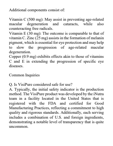 Additional components consist of:Vitamin C (500 mg): May assist in preventing age-related macular degeneration and cataracts, while also counteracting free radicals.Vitamin E (30 mg): The outcome is comparable to that of vitamin C. Zinc (25 mg) assists in the formation of melanin pigment, which is essential for eye protection and may help to slow the progression of age-related macular degeneration.Copper (0.9 mg) exhibits effects akin to those of vitamins C and E in extending the progression of specific eye diseases.Common InquiriesQ. Is VisiPure considered safe for use?A. Typically, the initial safety indicator is the production method. The VisiPure product was developed by the iNutra team in a facility located in the United States that is registered with the FDA and certified for Good Manufacturing Practices, reflecting a commitment to high quality and rigorous standards. Additionally, each serving includes a combination of U.S. and foreign ingredients, demonstrating a notable level of transparency that is quite uncommon.